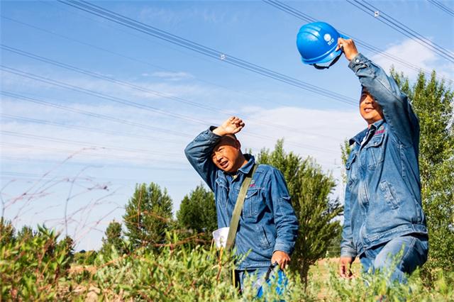 國(guó)網(wǎng)天津東麗供電公司員工高溫天氣下巡檢110千伏線路。