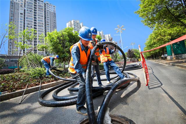 國(guó)網(wǎng)江西新余供電公司員工在城北仰天大道配電網(wǎng)改造工程現(xiàn)場(chǎng)敷設(shè)電纜。