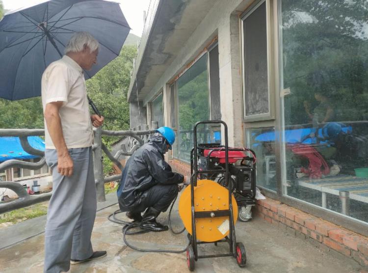 當(dāng)天中午,趁著地區(qū)雨量減弱的空隙,國網(wǎng)北京房山供電公司周口店供電所所長康福填和營配二班班長高春耕、營配一班組長袁樹立、營配一班組員張利一起,攜帶應(yīng)急發(fā)電機(jī),在確保安全的前提下緊急趕往20多公里外的北下寺村。距離目的地只有約1公里時,夾括河邊上的道路積水越來越多,部分路面被沖毀,搶修車已無法前進(jìn)。