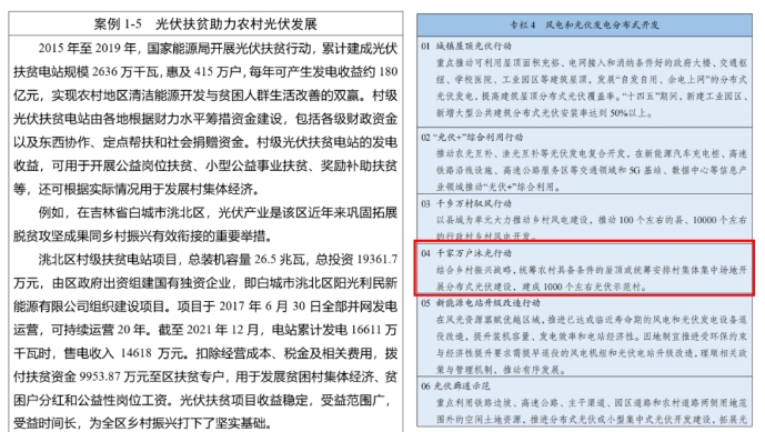 1、長期來看,鄉(xiāng)村振興是戶用光伏發(fā)展最大的機遇,分布式光伏將在農(nóng)村的能源轉(zhuǎn)型中發(fā)揮重要作用!1)國家能源局“戶用光伏+鄉(xiāng)村振興”規(guī)劃2022年6月,國家發(fā)改委、國家能源局、財政部等九部委聯(lián)合下發(fā)《“十四五”可再生能源發(fā)展規(guī)劃》,特別提出:千家萬戶沐光行動!結(jié)合鄉(xiāng)村振興戰(zhàn)略,統(tǒng)籌農(nóng)村具備條件的屋頂或統(tǒng)籌安排村集體集中場地開展分布式光伏建設,建成1000個左右光伏示范村。