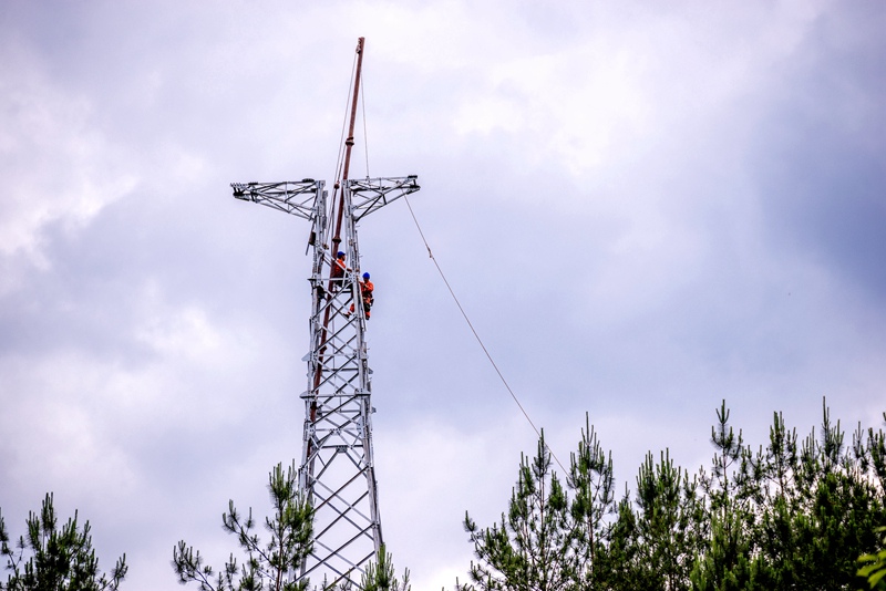 中國電力網(wǎng)訊   6月10日,室外氣溫高達28攝氏度,在四川省巴中市通江縣陳河鎮(zhèn)下江口村10社,國網(wǎng)通江縣供電公司施工人員有序開展涪陽變電站一河壩1井線路15號鐵塔組立工作。據(jù)了解,國網(wǎng)四川省巴中市通江縣供電公司積極服務(wù)地方經(jīng)濟發(fā)展,開辟供電服務(wù)綠色通道,從報裝申請、供電方案確定等方面提供優(yōu)質(zhì)高效的“一條龍”辦電服務(wù),為重點項目建設(shè)提供用電保障。程聰攝