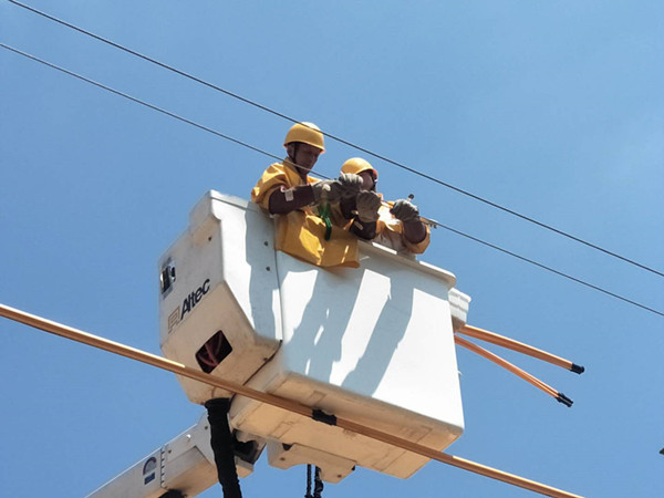 在排查好停電事故原因后,現(xiàn)場搶修人員開始積極的搶修線路工作,在搶修車輛到達現(xiàn)場,搶修人員安全措施執(zhí)行到位后,搶修人員帶電作業(yè)修復(fù)導(dǎo)線。雖然才上午11時許,但室外的溫度就已經(jīng)達到37攝氏,搶修人員登上升降車,在保證安全,規(guī)范操作的情況下,開始了導(dǎo)線的修復(fù)工作,搶修現(xiàn)場有序進行,在高溫酷暑的烈日下,經(jīng)過了45分鐘的揮汗如雨緊急搶修,終于恢復(fù)了10KV市山官樁支線的正常運行。搶修人員在完成工作后,脫去了厚重的安全工作服,自己的衣服已經(jīng)早已被汗水浸濕,望著他們身影,感嘆工作在一線搶修的師傅們真不容易,心中由衷的敬佩他們。(萬婉/文)(胡志強/圖)