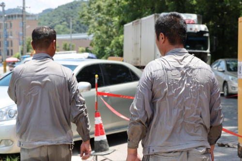 經(jīng)過持續(xù)一小時的高溫作業(yè),接線任務(wù)順利完成。兩名作業(yè)人員熱得直喘氣,被曬得通紅的臉上,汗水止不住地流,厚重的絕緣披肩下,工作服被汗水浸透,脫下的絕緣手套里更是倒出了一打汗水。略顯吃力地脫下黏在身上的工作服后,工作班成員葉曉聰長長地舒了一口氣:“我們每天做一個任務(wù)就得換一套衣服,任務(wù)多的話一天要換五六套衣服,沒辦法,衣服都被汗水濕透了。”正說著,他和工作班成員徐華一起用力擰著脫下來的衣服。“跟洗衣服似的,把衣服擰干晾曬繼續(xù)穿!”一旁的徐華打著赤膊,不好意思地笑了。