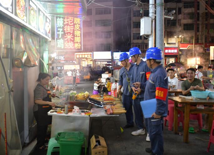中國電力網(wǎng)訊(通訊員李朝輝、石汶汶)“老板,生意紅火哈,這是我們24小時服務(wù)熱線,有什么用電需求及時聯(lián)系我們?yōu)槟銈兎?wù)。”7月19日21時許,在德江縣坨街米線小吃夜市上,南方電網(wǎng)德江供電局城區(qū)供電所黨員服務(wù)隊隊員張權(quán)和同事張玉軍、胡冬林正在對夜市攤點(diǎn)開展夜間特巡特維,用可靠電力守住儺城“煙火氣”。