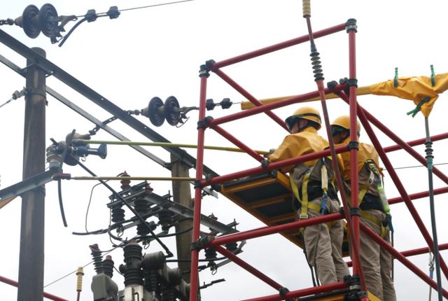 雙絕緣腳手架加旁路電纜帶電作業(yè)現場 葉凌云 攝