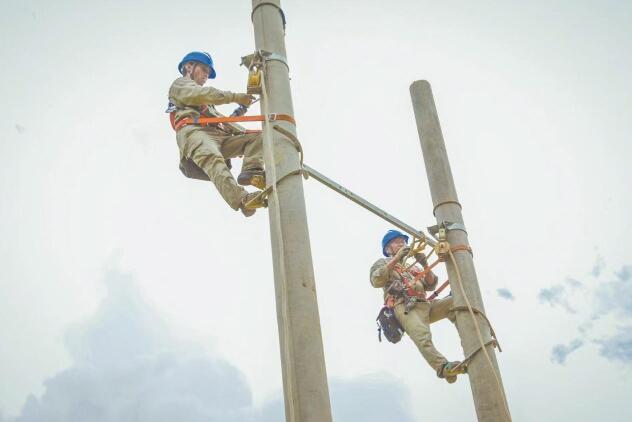 9時(shí)許,室外溫度已超過(guò)30攝氏度,隊(duì)員們?cè)跅U上桿下忙碌著。地面上,隊(duì)員邱榮軍轉(zhuǎn)動(dòng)線盤(pán)將導(dǎo)線一圈圈展開(kāi)進(jìn)行放線后,隊(duì)員蔣院生和邱德生拖拽導(dǎo)線,肩扛手拉著將導(dǎo)線牽引到電桿下方,隊(duì)員陳秋德和王發(fā)揮則操作牽引機(jī)將導(dǎo)線牽引上桿。桿上作業(yè)的陳志強(qiáng)等4名隊(duì)員迅速將導(dǎo)線吊拽到電桿橫擔(dān)上,并同步使用緊線鉗收緊導(dǎo)線。