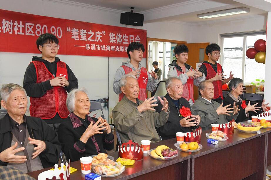 這是慈溪市白果樹社區(qū)第四屆“8090”耄耋老人集體生日會的現場。在重陽節(jié)來臨之際,浙江慈溪市錢海軍志愿服務中心攜同白果樹社區(qū)和寧波大學科學技術學院,為社區(qū)內30余名80歲以上老人們準備了蛋糕、壽面和精彩的節(jié)目表演,提前給老人們過一個集體生日。