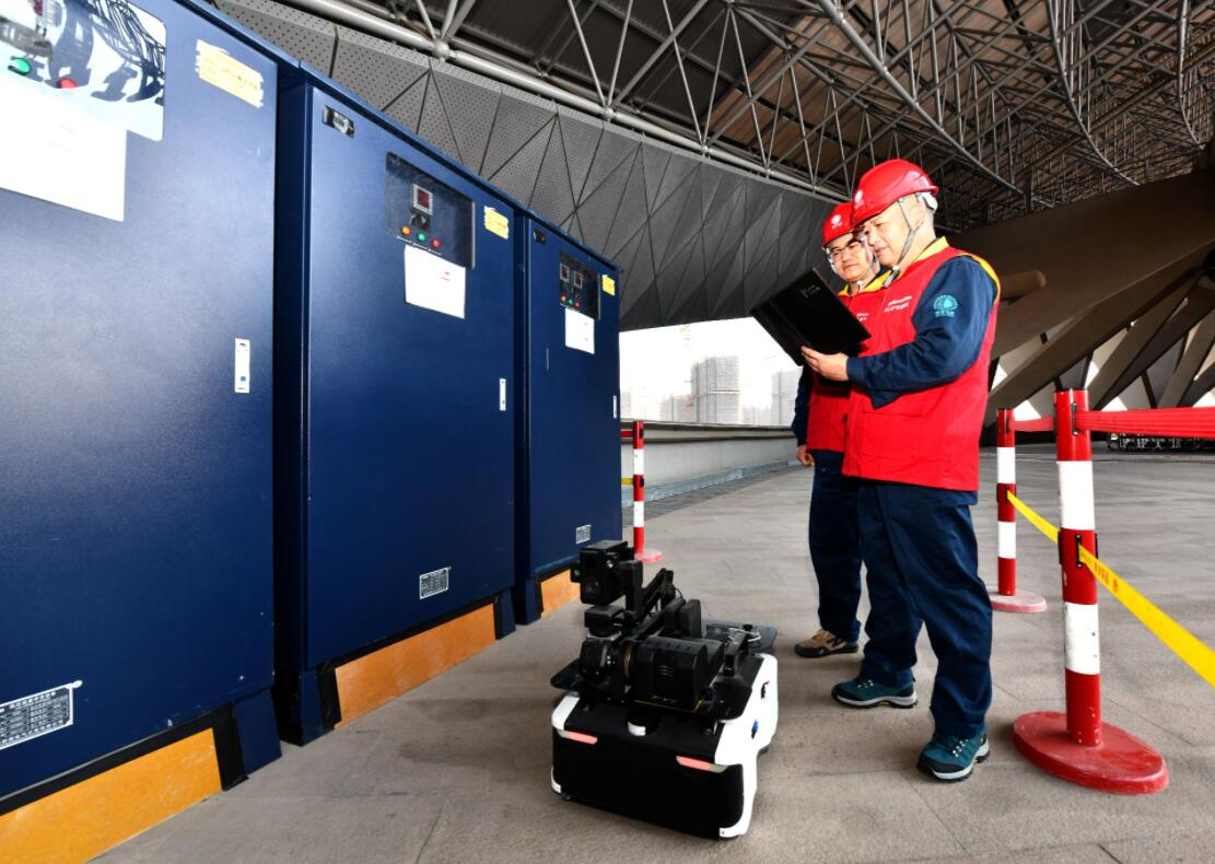 11月9日,在金華市體育中心,一臺智能巡檢機器人正在省運會場館中來回穿梭巡視,對區(qū)域內(nèi)電氣設(shè)備進(jìn)行檢測,國網(wǎng)武義縣供電公司保電運維人員在一旁記錄監(jiān)測數(shù)據(jù)。