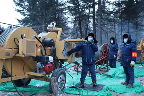 牽引機、電纜軸快速轉(zhuǎn)動,粗實的導(dǎo)線順著前方的鐵塔上的滑輪緩緩回收,導(dǎo)地線展放、張力緊線、附件安裝、導(dǎo)線壓接……冬季的寒風(fēng)刺骨,施工人員顧不上寒冷,加緊施工。