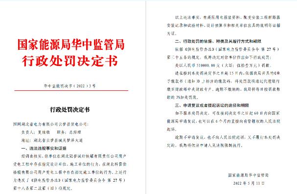 國(guó)家能源局華中監(jiān)管局12月7日公布的一則行政處罰信息顯示,國(guó)網(wǎng)湖北省電力有限公司云夢(mèng)縣供電公司在用戶受電工程中存在指定設(shè)計(jì)單位、施工單位的行為,被處以罰款51萬(wàn)元。