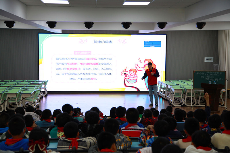 課堂上,該公司黨員服務(wù)隊隊員雷盧鈞從觸電的危害、觸電的方式、安全用電與預(yù)防措施、觸電急救等四個方面進行生動形象的講解,并通過有獎問答的方式與孩子們一同回顧了“生活用電小常識”、“錯誤用電的危害”等知識,孩子們紛紛舉手搶答,課堂氣氛反應(yīng)十分熱烈。