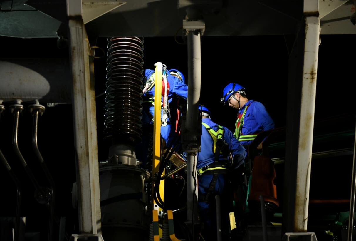 晚上19時23分,牟山變2號主變停役,消缺工作正式開始,變電運維人員在做好停電、驗電、掛設(shè)接地線和裝設(shè)安全圍欄等安全措施后,7名檢修人員爬上了主變,輪流開展搶修工作。當(dāng)天正值浙江入伏第一天,即使是晚上,仍有著30多度的高溫,悶熱的天氣和無處不在的蚊蟲給搶修工作帶來了不小的影響,不一會他們后背已經(jīng)悄然濕透,隨手一拍就是帶血的蚊子。