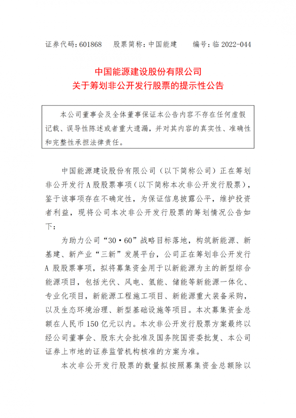 10月23日,中國(guó)能建公告稱,為助力公司“30·60”戰(zhàn)略目標(biāo)落地,構(gòu)筑新能源、新基建、新產(chǎn)業(yè)“三新”發(fā)展平臺(tái),公司正在籌劃非公開(kāi)發(fā)行A股股票事項(xiàng),擬將募集資金用于以新能源為主的新型綜合能源項(xiàng)目,包括光伏、風(fēng)電、氫能、儲(chǔ)能等新能源一體化、專業(yè)化項(xiàng)目,新能源工程施工項(xiàng)目、新能源重大裝備采購(gòu),以及生態(tài)環(huán)境治理、新型基礎(chǔ)設(shè)施等項(xiàng)目。據(jù)悉,本次募集資金總額在人民幣150億元以內(nèi)。本次非公開(kāi)發(fā)行股票方案最終以經(jīng)公司董事會(huì)、股東大會(huì)批準(zhǔn)及國(guó)務(wù)院國(guó)資委批復(fù)、本公司證券上市地的證券監(jiān)管機(jī)構(gòu)核準(zhǔn)的方案為準(zhǔn)。