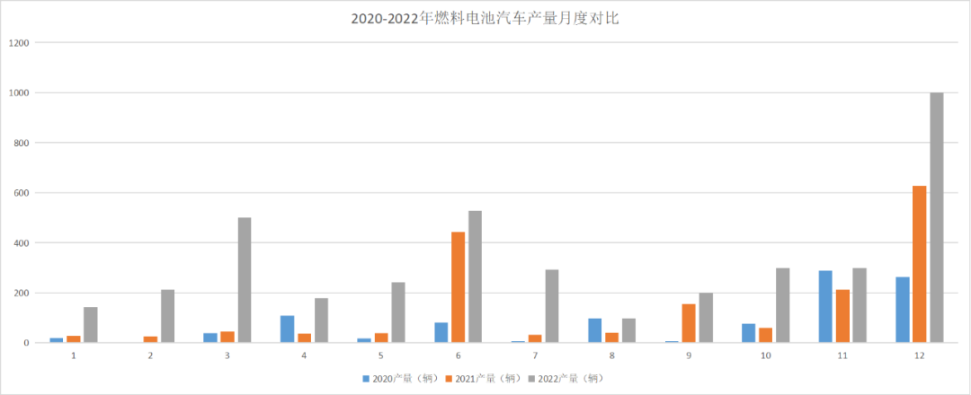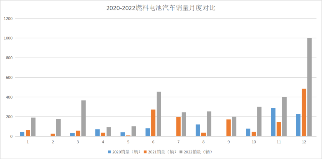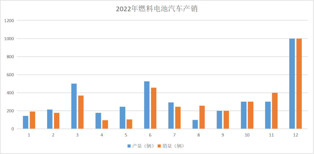 2022年全年,燃料電池汽車產銷分別完成0.4萬輛和0.3萬輛,同比增長105.4%和112.8%。其中,12月份完成產銷數量最多,均完成0.1萬輛;其次是3月份及6月份,3月,燃料電池汽車產銷分別完成500輛和367輛,同比增長10.1倍和5.2倍;6月,燃料電池汽車產銷分別完成527輛和455輛,同比增長18.7%和67.3%。