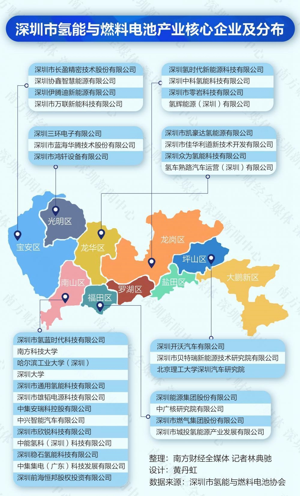 南方財經(jīng)全媒體記者梳理調(diào)研發(fā)現(xiàn),深圳市氫能相關企業(yè)主要分布在南山區(qū)、寶安區(qū)、龍華區(qū)和龍崗區(qū)。