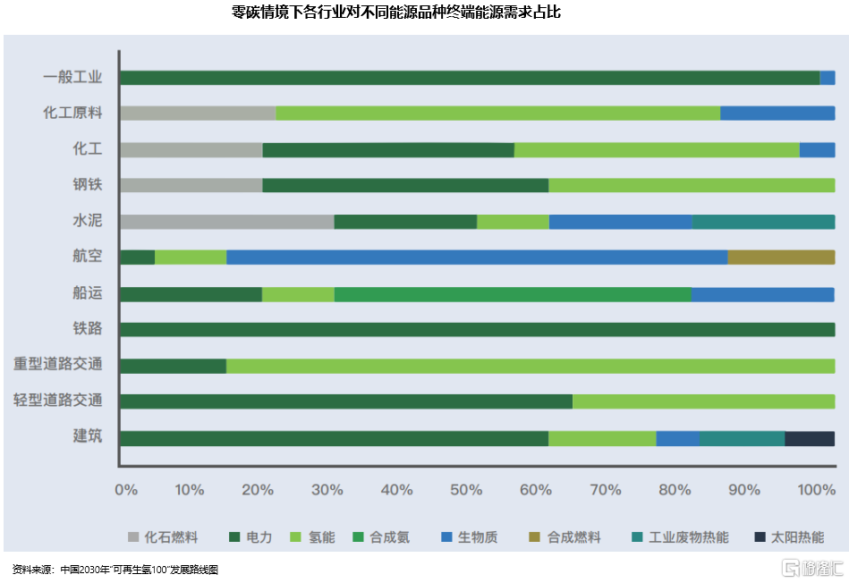 我們可以參考中國氫能聯(lián)盟研究院的數(shù)據(jù)。上圖是在零碳狀態(tài)下,各個行業(yè)終極的能源來源。在化工原料、化工、鋼鐵、重型交通運(yùn)輸?shù)刃袠I(yè),氫能都是絕對的第一主力。即使在那些電力絕對主導(dǎo)的行業(yè),氫能可能也是其電力的重要來源。
