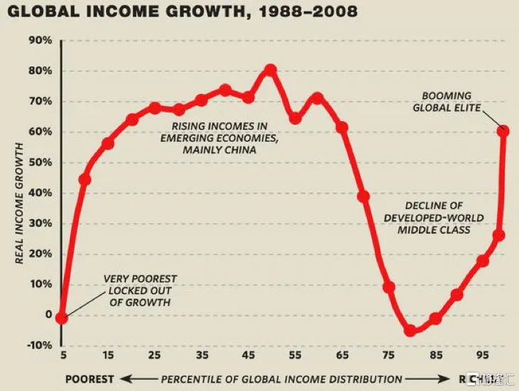 這就是那條著名的“大象曲線”,反映了全球收入的不平等狀況。從1988年到2008這20年間,收入增長最快的有兩部分人,一部分是發(fā)達(dá)國家那1%的全球化精英,另一部分是發(fā)展中國家的中產(chǎn)階級,尤其是中國。有贏就有輸,相對的輸家就是發(fā)達(dá)國家的中產(chǎn)階級和中下層階級。