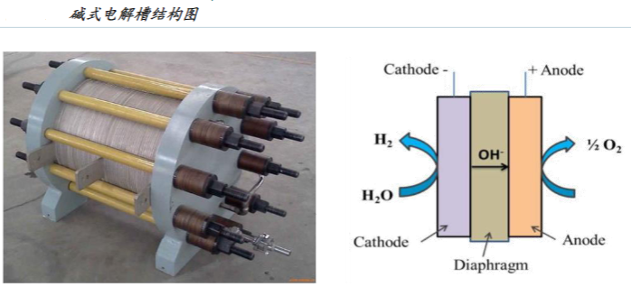 堿性電解技術(shù)成熟,單臺裝置規(guī)??蛇_(dá)1000Nm³/h以上,系統(tǒng)壽命長,成本較低,易于實(shí)現(xiàn)大規(guī)模應(yīng)用,是目前主流電解技術(shù)。其工作原理為:在電流作用下,水通過電化學(xué)反應(yīng)分解為氫氣和氧氣,并在電解池的陰極和陽極析出。水是弱電解質(zhì),需增強(qiáng)其導(dǎo)電能力,因此通常在水中加入NaOH、KOH等堿類物質(zhì)形成堿性電解質(zhì)。