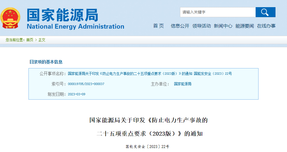 國(guó)家能源局關(guān)于印發(fā)《防止電力生產(chǎn)事故的二十五項(xiàng)重點(diǎn)要求(2023版)》的通知