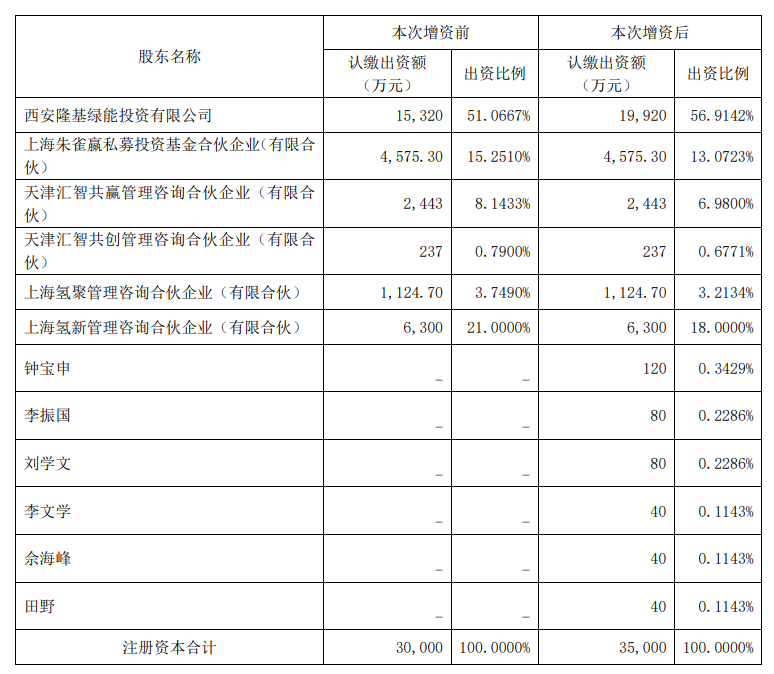 公告顯示,基于對隆基氫能未來發(fā)展的信心,根據(jù)經(jīng)營需要,公司通過全資子公司隆基投資向其控股子公司隆基氫能增資4.6億元,其中4600萬元增加隆基氫能注冊資本,4.14億元計入隆基氫能資本公積;公司董事、高級管理人員及經(jīng)營團隊核心管理人員鐘寶申、李振國、劉學文、李文學、佘海峰、田野六人向隆基氫能增資4000萬元,其中400萬元增加隆基氫能注冊資本,3600萬元計入隆基氫能資本公積。本次合計增資5億元,其中5000萬元增加隆基氫能注冊資本,4.5億元計入隆基氫能資本公積,本次增資完成后,隆基氫能的注冊資本將增加至3.5億元。