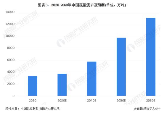 根據(jù)中國(guó)氫能聯(lián)盟的預(yù)測(cè),2020 年以后中國(guó)氫能需求將持續(xù)增加,尤其是 2030 年以后,為達(dá)成 " 碳中和、碳達(dá)峰 " 的目標(biāo),氫能需求量將大增。到 2060 年,中國(guó)氫能年需求將超過(guò) 1.3 億噸。