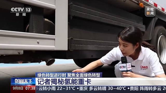 總臺央視記者 張叢婧:這個氫能重卡最大的不同就在于,您看在車頭和貨箱之間,有一個這樣的大箱子,里面裝的就是氫燃料。