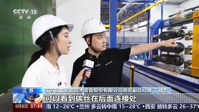 江蘇國富氫能技術(shù)裝備股份有限公司常務(wù)副總經(jīng)理 丁鐳哲:這里是我們的核心工藝之一,碳纖維纏繞。你可以看到碳絲在后面連接處,就像一個織布機一樣,一層一層往上織。碳纖維主要是用來承壓的。