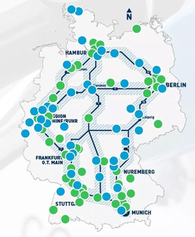 H2M在德國已經(jīng)運(yùn)營(綠色)及在建加氫站(藍(lán)色)示意圖