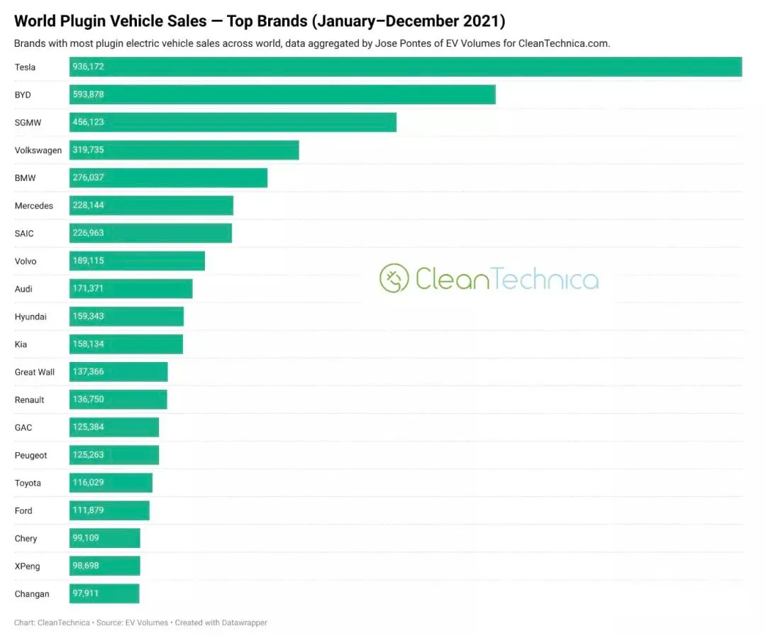 其中,中國品牌8家分別為比亞迪、上汽集團、上汽乘用車、長城歐拉、廣汽埃安、奇瑞集團、小鵬汽車以及長安汽車。比亞迪以59.39萬輛的銷量排名第2,實現(xiàn)了超過220%的同比增長,全球市場份額達9.1%。上汽集團以45.61萬輛的銷量排名第3名。上汽乘用車以22.70萬輛的銷量排名第7名。長城歐拉以13.74萬輛的銷量排名第12名。廣汽埃安以12.54萬輛的銷量排名第14名。奇瑞集團以9.91萬輛的銷量排名第18名。小鵬汽車以9.86萬輛的銷量排名第19名,小鵬P7車型銷量創(chuàng)下歷史新高,也是其首次進入年度前20名。長安汽車以9.79萬輛的銷量排名第20名。