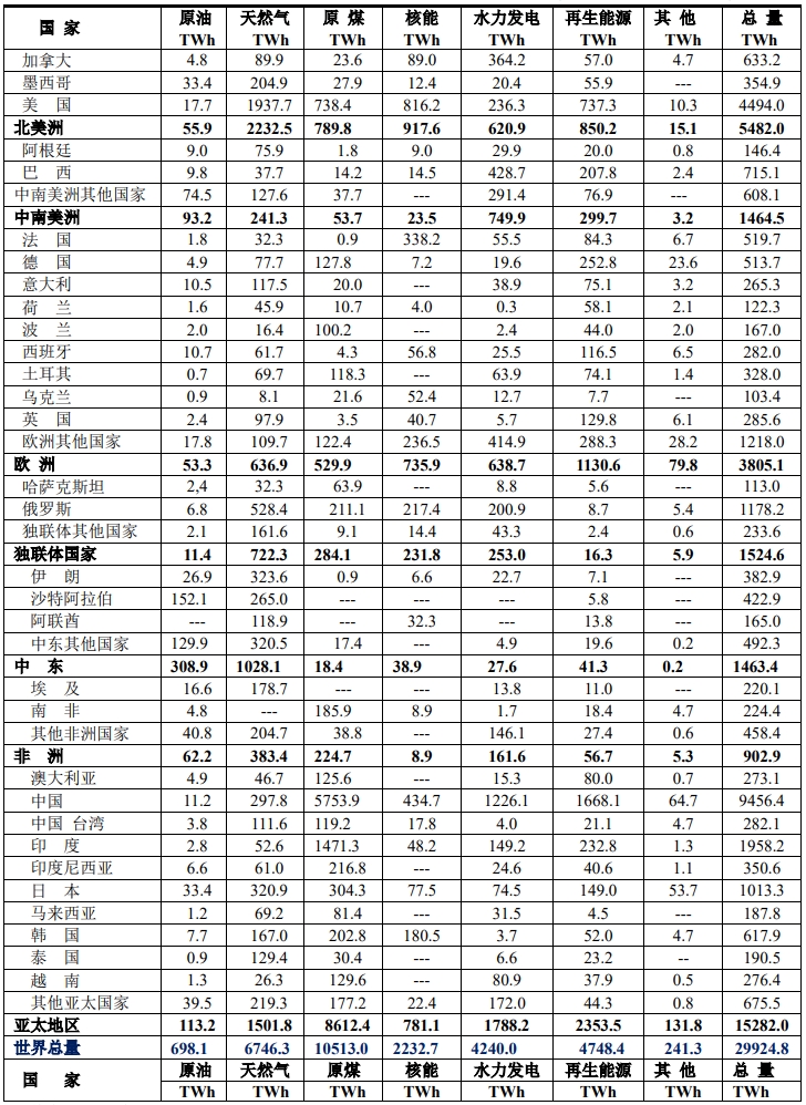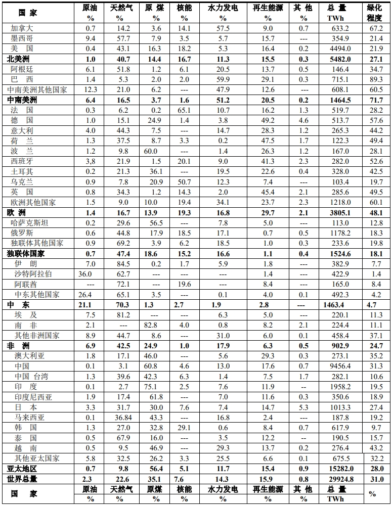 電力結(jié)構(gòu)是指電力來(lái)自一次能源的比例,由于各國(guó)所處的地理位置不同,資源貧富程度各不相同,甚至相差甚遠(yuǎn),這就構(gòu)成了世界各國(guó)各不相同的電力結(jié)構(gòu)。為了全面理解各個(gè)國(guó)家的電力結(jié)構(gòu),本文采用兩種形式來(lái)表示:⑴ 用各國(guó)一次能源生產(chǎn)的電力(TWh)來(lái)表示;⑵ 將各國(guó)一次能源生產(chǎn)的電力化為百分率來(lái)觀(guān)察電力綠化程度。