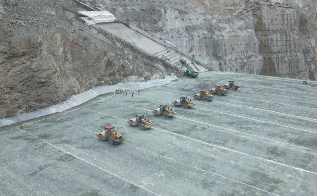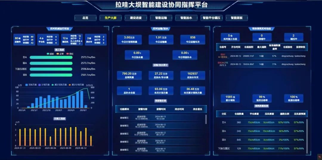 為保障世界級(jí)工程高效率高質(zhì)量建設(shè),項(xiàng)目團(tuán)隊(duì)不斷優(yōu)化施工規(guī)劃,全面應(yīng)用無(wú)人碾壓、智能物料、智能加水、智能攤鋪等技術(shù)聯(lián)動(dòng)的智慧大壩協(xié)同指揮平臺(tái),全方位提升大壩填筑效率與質(zhì)量。截至目前,拉哇水電站大壩日填筑方量已突破3萬(wàn)方,月填筑方量接近100萬(wàn)方,月上升高度超過(guò)13.2米,為目前國(guó)內(nèi)上升速度最快的混凝土面板堆石壩。