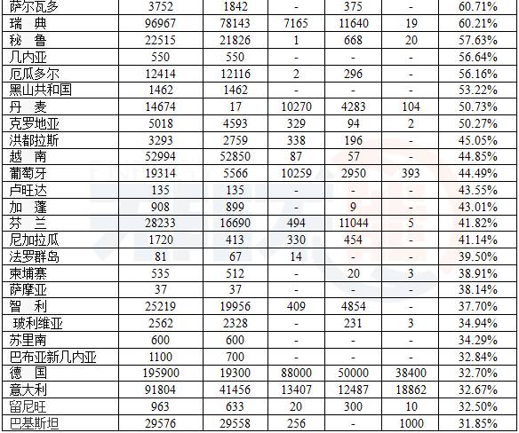 如果把2015年全球再生能源發(fā)電占發(fā)電總量的23.7%畫一條線,有88個國家超過此底線;只有66個國家沒有沒有達(dá)到,其中以經(jīng)濟(jì)發(fā)達(dá)國家居多。表2以再生能源發(fā)電占發(fā)電總量的比例排序。