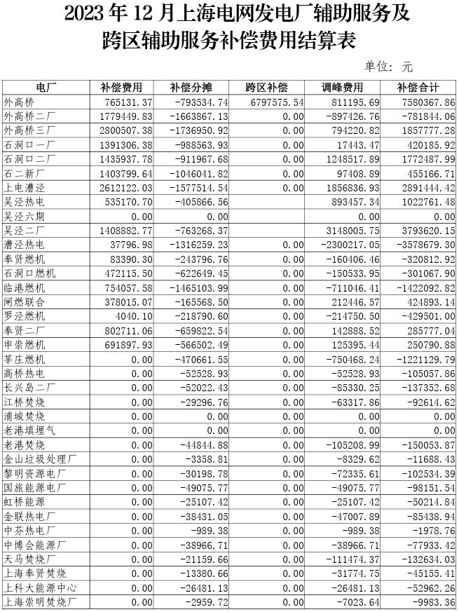 根據(jù)《華東區(qū)域并網(wǎng)發(fā)電廠輔助服務管理實施細則》及向家壩水電站與上海電網(wǎng)跨區(qū)輔助服務補償試點相關(guān)文件要求,國網(wǎng)上海市電力公司完成了2023年10-12月直調(diào)發(fā)電廠輔助服務及跨區(qū)輔助服務補償數(shù)據(jù)的統(tǒng)計計算,并向我局報送了發(fā)電廠輔助服務補償情況。根據(jù)向家壩跨區(qū)補償費用補償原則,10-12月補償費用用于補償上海電網(wǎng)30萬千瓦及60萬千瓦亞臨界公用燃煤發(fā)電機組提供的調(diào)停服務。2023 年10-12月各發(fā)電廠輔助服務補償數(shù)據(jù)詳見附件,現(xiàn)予公示。如有不同意見,可于2024年3月1日前向我局反映。