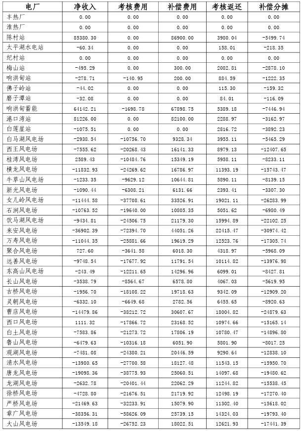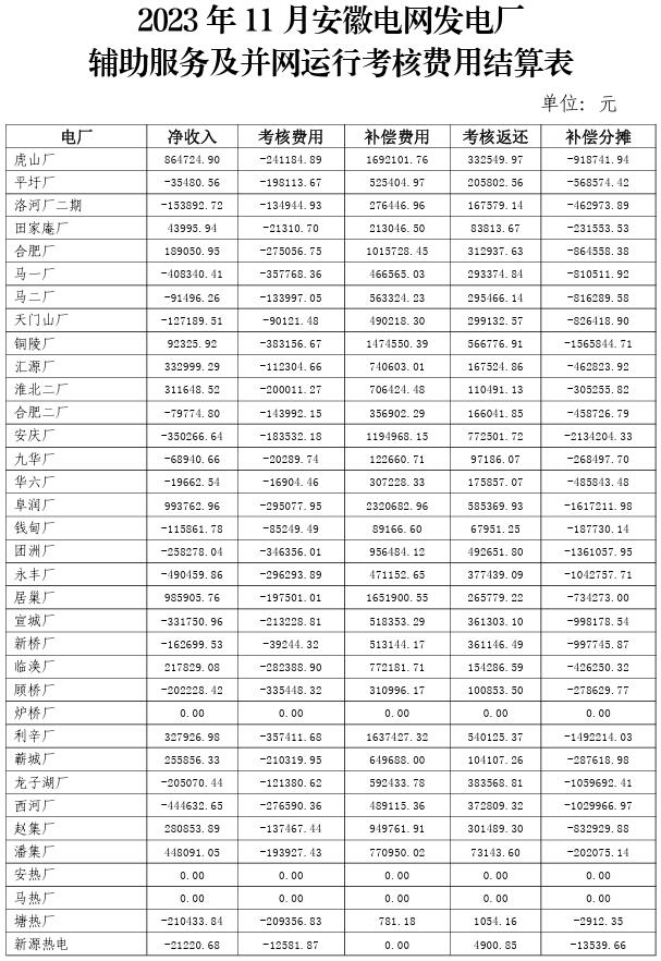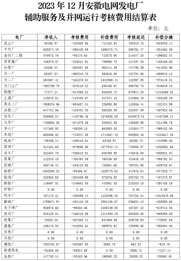 根據(jù)華東區(qū)域“兩個細(xì)則”規(guī)則要求,國網(wǎng)安徽省電力有限公司完成了2023年10-12月直調(diào)電廠并網(wǎng)運行考核、輔助服務(wù)補償統(tǒng)計計算,并向我局報送了并網(wǎng)運行考核及輔助服務(wù)補償情況。其中,吉泉直流配套跨省跨區(qū)新建火電機組調(diào)試運行期差額資金共計8882813.74元,納入12月輔助服務(wù)補償。2023年10-12月安徽電網(wǎng)發(fā)電廠輔助服務(wù)補償及并網(wǎng)運行考核費用結(jié)算表詳見附件,現(xiàn)予公示。如有不同意見,可于3月1日前向我局反映。