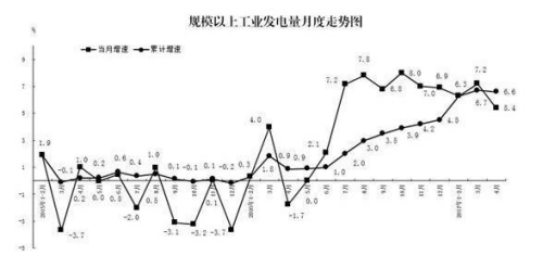 1-4月份,發(fā)電量19382.4億千瓦時,同比增長6.6%,增速比1-3月份回落0.1個百分點。