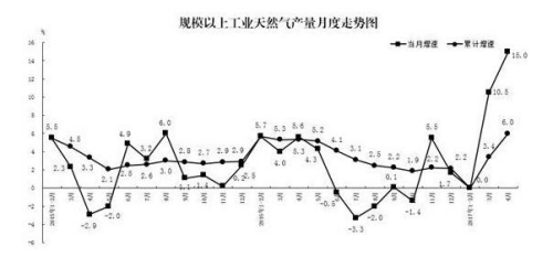 1-4月份,天然氣產(chǎn)量509.4億立方米,同比增長6.0%。進(jìn)口2011萬噸[4],增長5.4%。