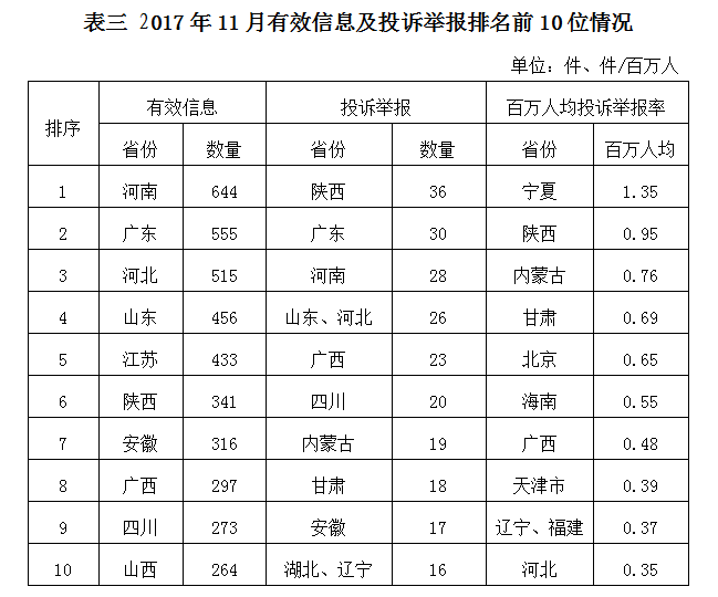 2017年11月,各?。ㄗ灾螀^(qū)、直轄市)按照有效信息數(shù)量排序,河南、廣東、河北等省列全國前10位;按照投訴舉報(bào)數(shù)量排序,陜西、廣東、河南等省排在全國前10位;按照百萬人均投訴舉報(bào)率排序,寧夏,陜西,內(nèi)蒙古等省位于全國前10位。(2017年11月有效信息及投訴舉報(bào)排名前10位情況見表三)