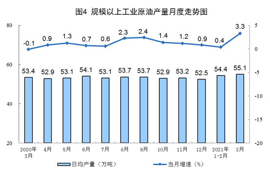 原油生產(chǎn)加快,加工量較快增長。3月份,生產(chǎn)原油1709萬噸,同比增長3.3%,比2019年3月份增長3.3%,兩年平均增長1.6%,日均產(chǎn)量55.1萬噸。加工原油5979萬噸,同比增長19.7%,比2019年3月份增長11.8%,兩年平均增長5.8%,日均加工192.9萬噸。