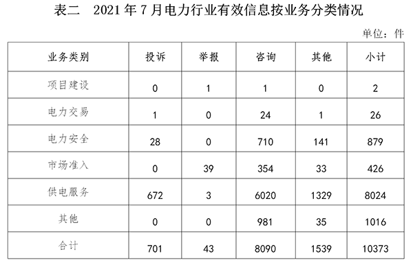 電力行業(yè)排在首位,有效信息數(shù)量為10373件,占全部有效信息的80.90%。群眾關(guān)注的內(nèi)容主要集中在故障停電、供電安全、電表計(jì)量咨詢等方面。(2021年7月電力行業(yè)有效信息按業(yè)務(wù)分類情況見(jiàn)表二)