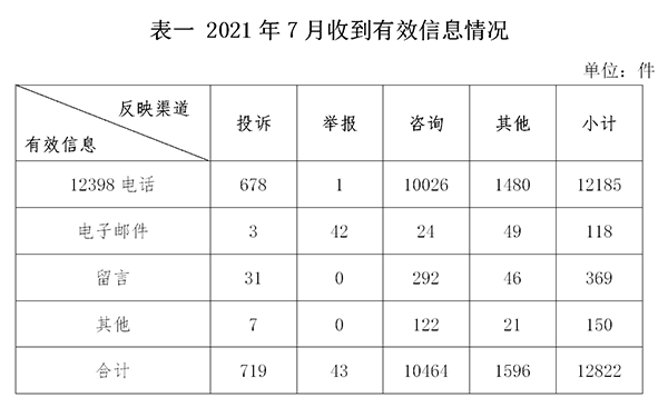 2021年7月,國(guó)家能源局12398能源監(jiān)管熱線(以下簡(jiǎn)稱12398熱線)共收到有效信息12822件(包含投訴、舉報(bào)、咨詢和其他訴求類別),環(huán)比增加29.52%,同比增加11.58%。(2021年7月收到有效信息情況見(jiàn)表一)