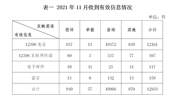 2021年11月,國家能源局12398能源監(jiān)管熱線(以下簡稱12398熱線)共收到有效信息12933件(包含投訴、舉報、咨詢和其他訴求類別),環(huán)比增加21.81%,同比增加34.93%。(2021年11月收到有效信息情況見表一)
