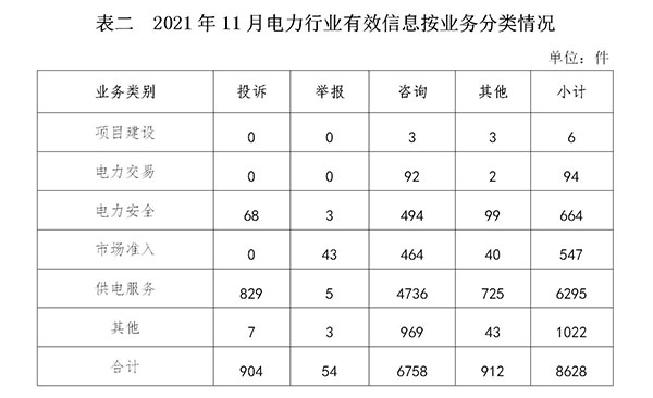 電力行業(yè)排在首位,有效信息數(shù)量為8628件,占全部有效信息的66.71%。群眾關(guān)注的內(nèi)容主要集中在故障停電、供電安全、電費計量和收繳等方面。(2021年11月電力行業(yè)有效信息按業(yè)務(wù)分類情況見表二)
