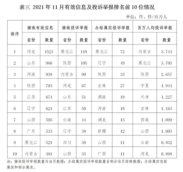 各省(自治區(qū)、直轄市)按照接收的有效信息數(shù)量排序,河北、山東、河南、陜西、江蘇、遼寧、山西、廣東、黑龍江、內(nèi)蒙古排在全國前10位;按照接收的投訴舉報數(shù)量排序,黑龍江、陜西、內(nèi)蒙古、河北、山東、江蘇、云南、遼寧、四川、山西排在全國前10位;按照辦結(jié)屬實的投訴舉報數(shù)量排序,黑龍江、遼寧、陜西、吉林、湖南、河南、湖北、新疆、廣西、山西排在全國前10位;按照百萬人均投訴舉報數(shù)量排序,內(nèi)蒙古、黑龍江、陜西、寧夏、天津、吉林、西藏、山西、云南、河北排在全國前10位。(2021年11月有效信息及投訴舉報排名前10位情況見表三)