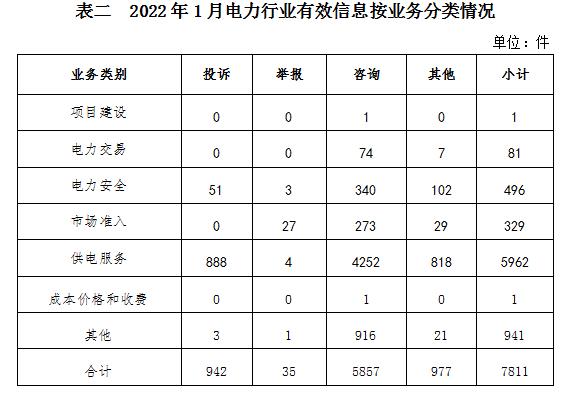 電力行業(yè)排在首位,有效信息數(shù)量為7811件,占全部有效信息的64.71%。群眾關(guān)注的內(nèi)容主要集中在故障停電、供電安全、電費(fèi)計(jì)量和收繳等方面。(2022年1月電力行業(yè)有效信息按業(yè)務(wù)分類情況見(jiàn)表二)