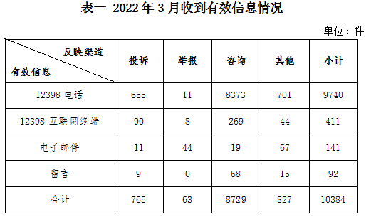 2022年3月,國家能源局12398能源監(jiān)管熱線(以下簡稱12398熱線)共收到有效信息10384件(包含投訴、舉報(bào)、咨詢和其他訴求類別),環(huán)比增加24.12%,同比增加23.14%。(2022年3月收到有效信息情況見表一)