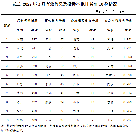 各省(自治區(qū)、直轄市)按照接收的有效信息數(shù)量排序,河南、河北、山東、江蘇、四川、廣東、陜西、浙江、遼寧、安徽排在全國前10位;按照接收的投訴舉報(bào)數(shù)量排序,四川、江蘇、山東、河南、遼寧、浙江、河北、陜西、廣東、云南排在全國前10位;按照辦結(jié)屬實(shí)的投訴舉報(bào)數(shù)量排序,湖南、湖北、重慶、四川、陜西、廣西、甘肅、山西、河南、江蘇排在全國前10位;按照百萬人均投訴舉報(bào)數(shù)量排序,青海、天津、遼寧、甘肅、內(nèi)蒙古、陜西、北京、吉林、云南、上海排在全國前10位。(2022年3月有效信息及投訴舉報(bào)排名前10位情況見表三)