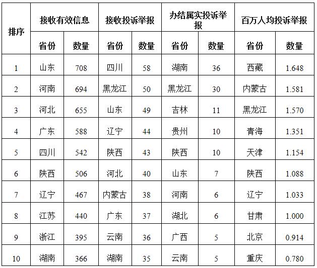 各省(自治區(qū)、直轄市)按照接收的有效信息數(shù)量排序,山東、河南、河北、廣東、四川、陜西、遼寧、江蘇、浙江、湖南排在全國前10位;按照接收的投訴舉報數(shù)量排序,四川、黑龍江、山東、遼寧、陜西、河北、內蒙古、廣東、云南、湖南排在全國前10位;按照辦結屬實的投訴舉報數(shù)量排序,湖南、黑龍江、吉林、貴州、陜西、山東、河南、湖北、廣西、云南排在全國前10位;按照百萬人均投訴舉報數(shù)量排序,西藏、內蒙古、黑龍江、青海、天津、陜西、遼寧、甘肅、北京、重慶排在全國前10位。(2022年4月有效信息及投訴舉報排名前10位情況見表三)