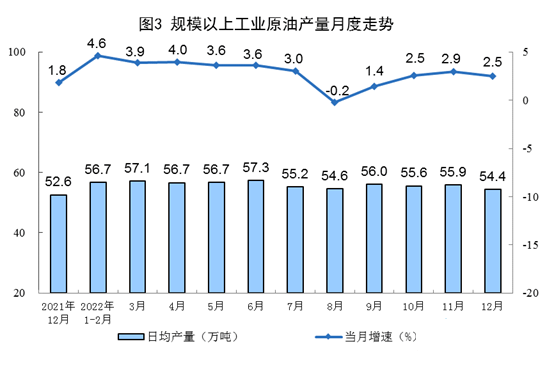 原油加工增速有所加快。12月份,加工原油5988萬噸,同比增長2.5%,增速比上月加快2.2個百分點,日均加工193.2萬噸。2022年,加工原油67590萬噸,同比下降3.4%。