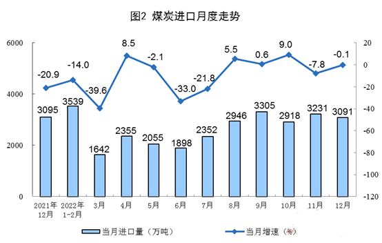 2022年,生產(chǎn)原煤45.0億噸,同比增長9.0%。進口煤炭2.9億噸,同比下降9.2%。