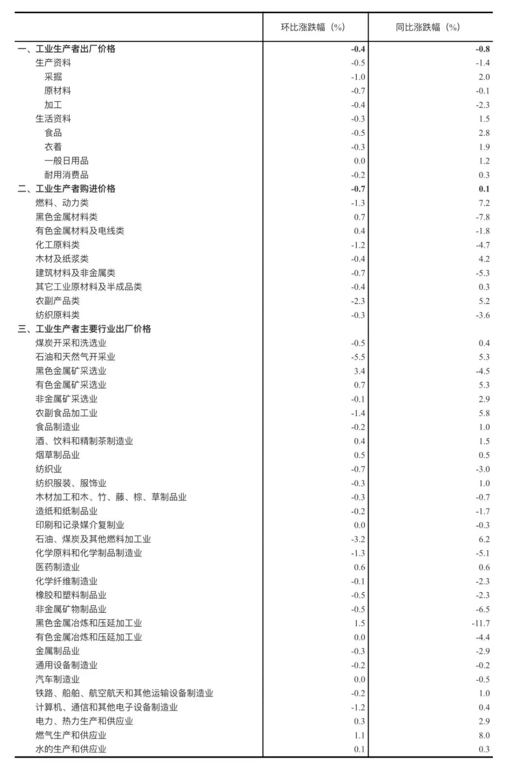 工業(yè)生產(chǎn)者購進價格中,農(nóng)副產(chǎn)品類價格下降2.3%,燃料動力類價格下降1.3%,化工原料類價格下降1.2%,建筑材料及非金屬類價格下降0.7%;黑色金屬材料類價格上漲0.7%,有色金屬材料及電線類價格上漲0.4%。
